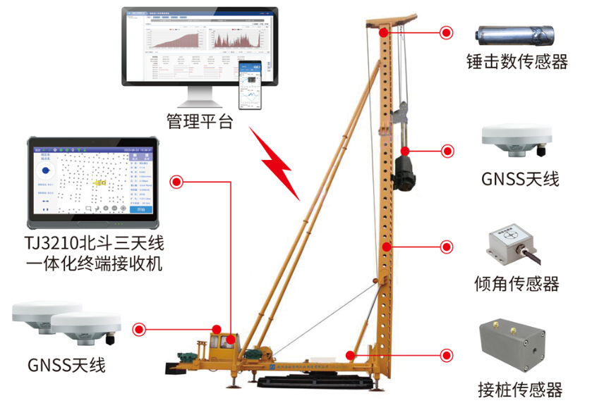 在传统柴油锤击管桩施工领域,长期存在三大核心痛点:一是施工数据采集严重依赖人工记录,易出现错记、漏记、伪造数据等问题,导致工程质量追溯困难;二是桩机作业状态监管滞后,无法实时掌握锤击数、桩身垂直度等关键参数,易引发断桩、偏位等质量事故;三是多方协同效率低下,业主、总包、施工单位间数据传递不及时,导致管理决策滞后。北京天玑科技IPS-100C柴油锤击管桩施工信息化系统通过北斗高精度定位与多传感器融合技术,构建起"感知-分析-决策-优化"的全流程数字化管理闭环,为破解行业痛点提供了系统性解决方案。